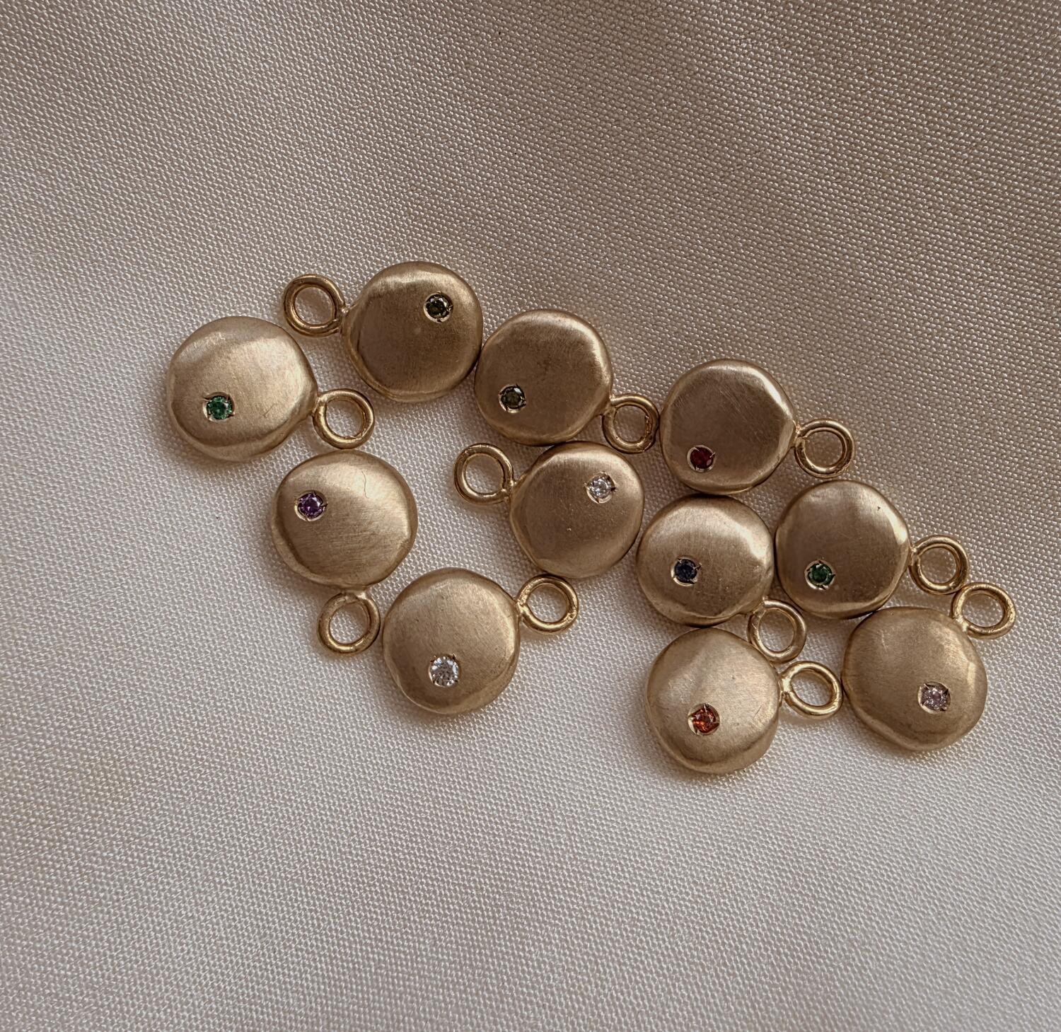 I ciondoli pepita sono realizzati in bronzo con finitura opaca e presentano uno zircone di 1.5 mm che rappresenta la pietra di nascita.